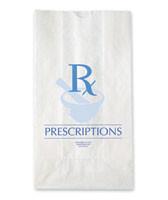 Our white paper Pharmacy Bags help pharmacies respect customer privacy. Bags have a pharmacy graphic and the word "Prescriptions" printed in blue ink.
