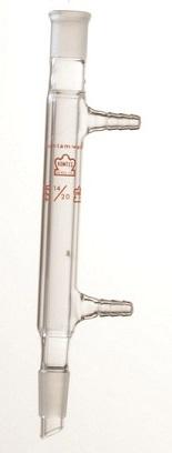 Description:The narrow annular space of the West design provides high cooling efficiency due to the increased flow rate of the cooling medium. · Medium length Standard Taper joints · Inner tube is light-walled with a small diameter jacket to keep minimal space between jacket and tube · Hose connections accept 5/16 inch ID flexible tubing · Manufactured from 33 expansion, low extractable borosilicate glass conforming to USP Type I and ASTM E438, Type I, Class A requirements | |